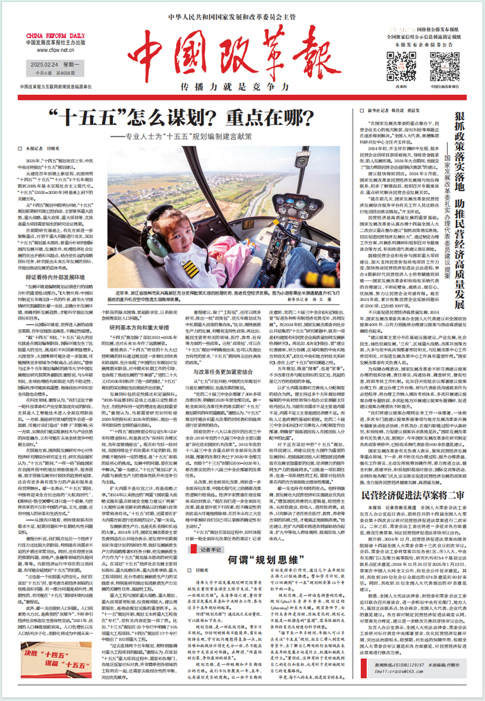 “十五五”规划在谋划过程中,如何体现对新一轮全面深化改革任务的落实?记者注意到,党的二十届三中全会《决定》提出,要“促进各种所有制经济优势互补、共同发展”。而2024年初,国家发展改革委向社会公开征集的“十五五”研究课题中,就有一项是《构建国有和民营企业高质量协同发展新格局研究》。再比如,《决定》提出,要“建立权责清晰、财力协调、区域均衡的中央和地方财政关系”。《优化中央和地方财政关系研究》,亦在上述“十五五”研究课题之列。