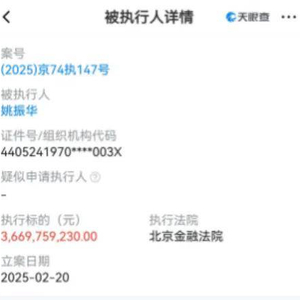 曾以“万宝之争”震动资本圈的姚振华,正经历其商业生涯的至暗时刻。天眼查最新数据显示,2月24日,这位深圳市宝能投资集团董事长新增一则被执行人信息,执行标的36.7亿元,由北京金融法院强制执行。至此,其名下累计被执行金额已达489亿元。