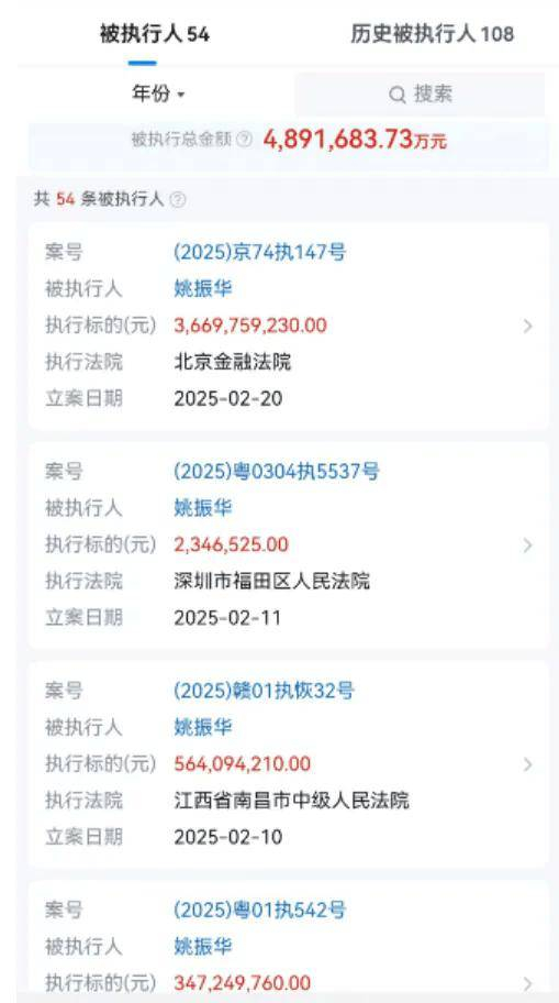 2025年开年仅两个月,姚振华已遭遇密集司法追击:除北京金融法院36.7亿元大额执行外,1月3日至2月11日间,佛山、广州、南昌、深圳四地法院接连出手,执行标的从235万元至5.64亿元不等。如此高频的跨区域执行,债权人或对已对宝能系丧失耐心,转而寻求司法手段快速变现。