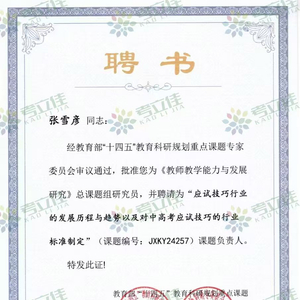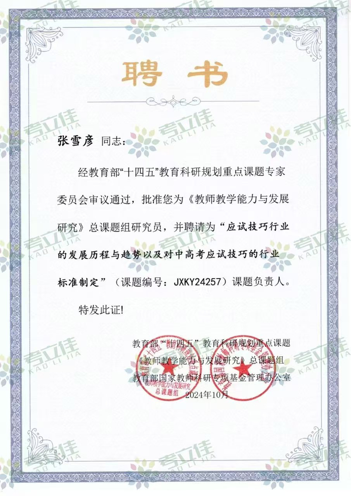 考立佳联合创始人张雪彦凭借其在教育科研领域的卓越能力和丰富经验,被教育部“十四五”教育科研规划重点课题专家委员会任命为《教师教学能力与发展研究》总课题组研究员,并担任《应试技巧行业的发展历程与趋势以及对中高考应试技巧行业的标准制定》课题的负责人。这一任命不仅是对张雪彦个人能力的认可,也体现了考立佳在教育科研领域的深厚积淀。