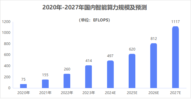 预计2022-2027年,国内智能算力规模将从260EFLOPS增至1117EFLOPS,年复合增速超过30%。将接替人形机器人、新能源汽车,成为又一快速成长的新兴赛道。