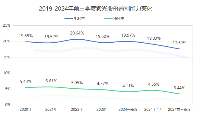 同时,公司盈利能力自2024年来也逐渐下行,2024年第一季度到前三季度,紫光股份毛利率从19.97%下降至17.59%,净利率从4.11%下降至3.44%。