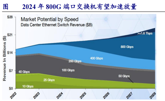 伴随AI发展,数据中心超大规模组网需求持续提升,提高了对高速率端口交换机需求。预计2024年800G端口交换机放量,2026年1.6T端口交换机放量。