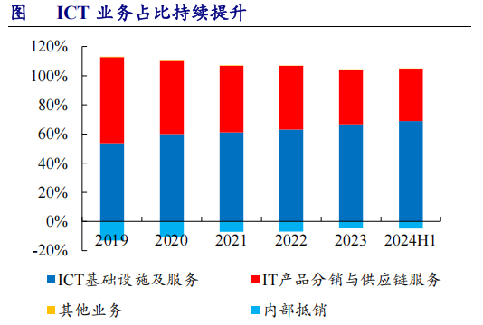 近年来,ICT业务占比逐渐提升,2024上半年实现营收261.54亿元,营收占比为68.9%。