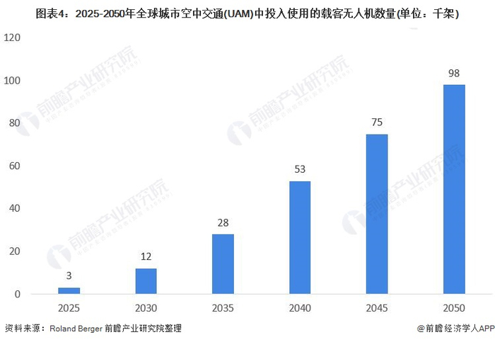 根据罗兰·贝格研究报告的预测,全球“飞行汽车”市场将迎来爆发式增长。到2050年,全球将有98000架“飞行汽车”用作空中出租车、机场班车和城际航班服务。摩根士丹利数据也预测,到2040年,全球城市空中交通市场规模将达到1万亿美元,并有望最终攀升至9万亿美元的市场规模。