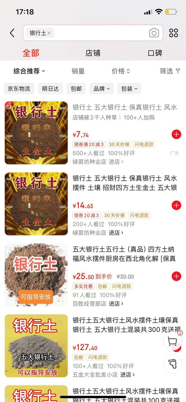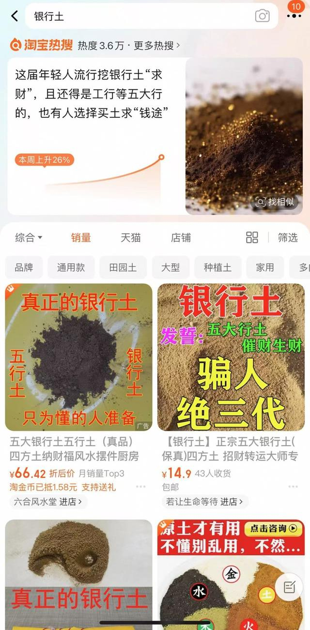 从银行网点附近挖取的泥土被标榜有“聚财”的玄学功效,有网店在肆意兜售。这一怪象正在多个社交平台和电商平台存在,且受到部分年轻人的追捧。