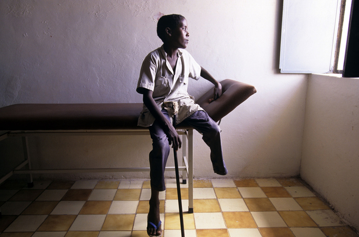 1996年12月,非洲卢旺达,一名截肢男孩坐在医院床上等待检查。在1994年的卢旺达种族大屠杀中,他被砍断了脚。