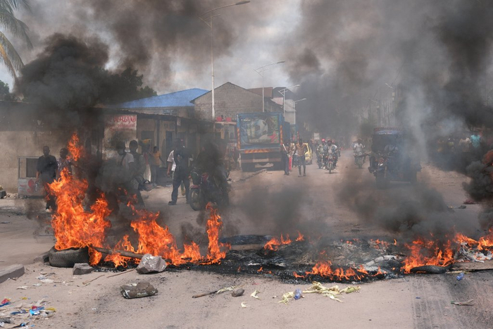 当地时间2025年1月28日,刚果民主共和国金沙萨,“M23运动”成员点燃火焰,并封锁部分道路。
