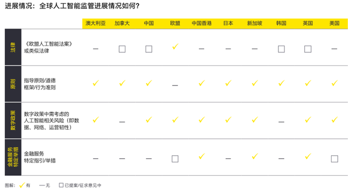 目前,人工智能监管尚无全球统一的方法。一些国家和地区正在寻求适用于多个部门的立法解决方案,但进展速度不一。