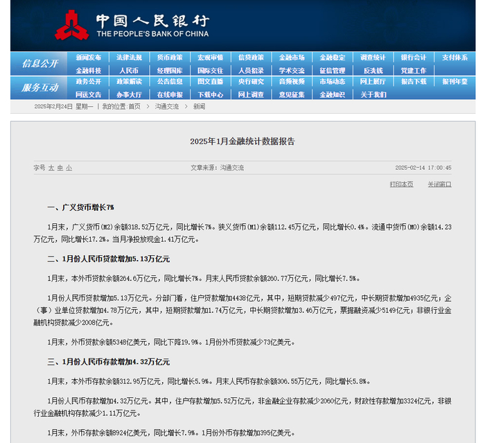 根据中国人民银行发布的2025年1月金融统计数据报告,以下是一些关键数据: