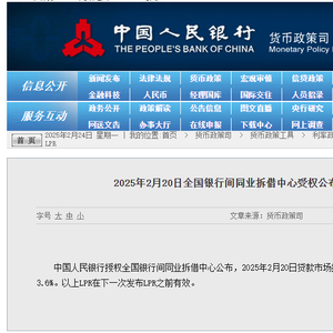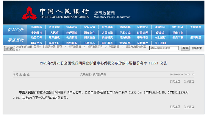 中国人民银行最新公告显示,2025年2月20日的贷款市场报价利率(LPR)如下: