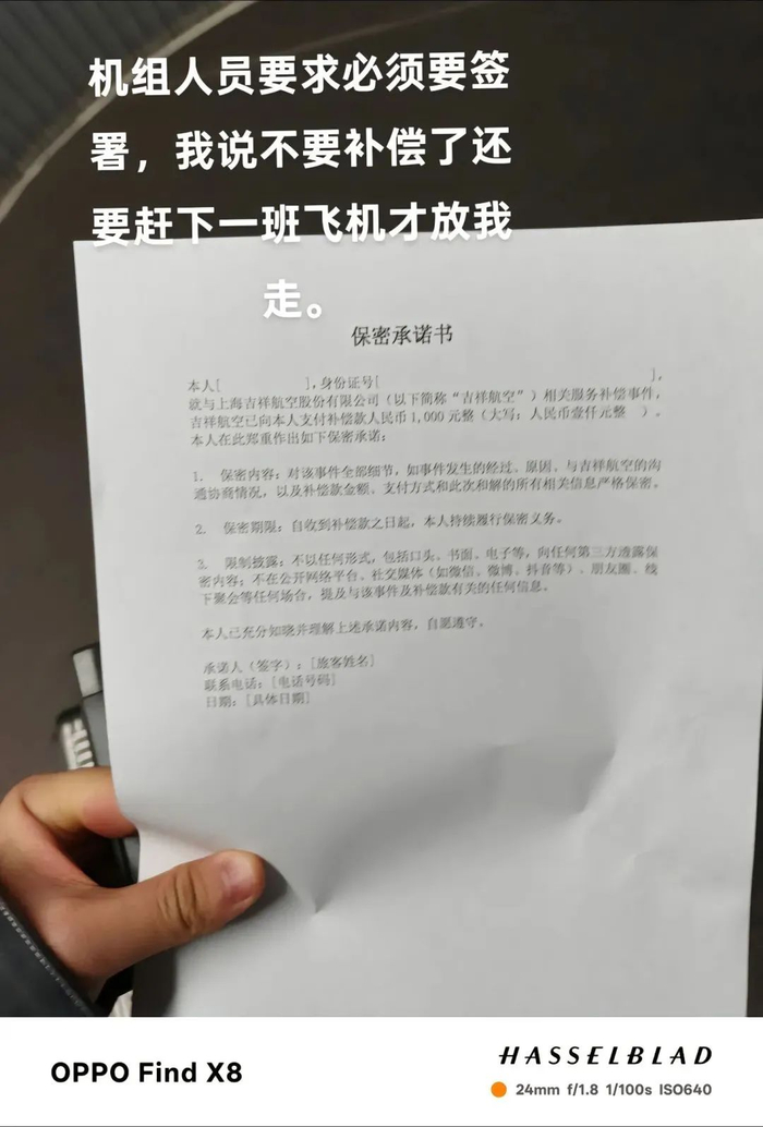 乘客提供的保密协议显示,吉祥航空承诺给乘客1000元补偿,但乘客不得通过任何方式向第三方透露协议内容。
