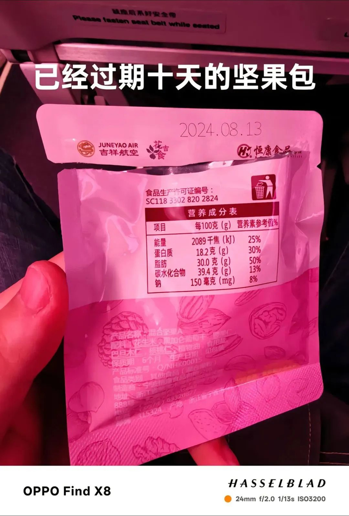 这名乘客提供当时的食品包装,包装显示,这个坚果的生产日期为2024年8月13日,已经过期10天。