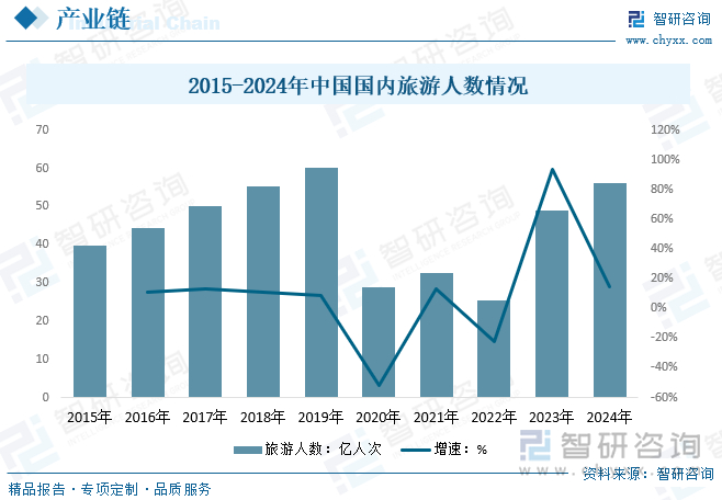 实景演出行业下游行业主要是旅行社行业以及散团游客,旅行社组织的客源流量和服务水平等因素直接影响实景演出行业的规模发展。从国内旅游客流量方面来看,2022年,旅游业持续受到疫情的全面重创,经历了自2020年以来最艰难、煎熬的一年,全行业经历了发展的低谷与“至暗时刻”,国内旅游人数下降至25.3亿人次。2023年以来,随着疫情影响褪去,国内经济开始复苏,国内旅游行业也随之强势复苏,被压抑三年的出游需求得以释放,掀起国民出游新热潮。数据显示,2024年我国国内旅游人数增长至56.15亿人次,同比增长14.8%。