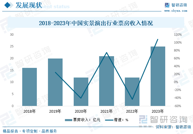 近年来,我国经济发展虽面临着一定挑战,但总体延续了平稳快速的发展态势。随着我国居民消费水平不断提高、可支配收入稳定增长,其消费观念也在发生着由“物质”到“精神”的升级转变,对于文化消费的需求愈加强烈。随着观众观演需求上升,加之政府对文化演出产业支持力度不断加大,市场主体活跃度持续提高,多种有利因素为实景演出市场的复苏和发展提供了保障。从行业收入情况来看,受疫情因素影响,近年来我国实景演出行业票房收入整体呈波动态势,到2023年收入规模为25亿元,六年来首创新高。