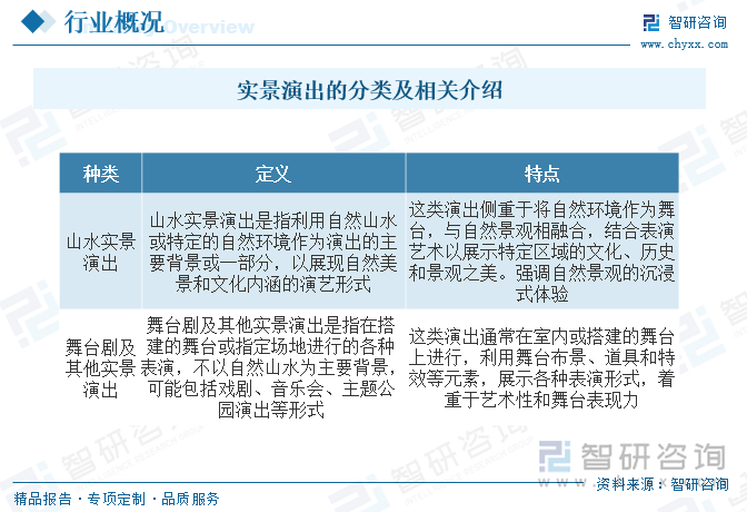 实景演出可以按照不同的表演风格、场地特点和呈现方式进行细分,主要可分为两类:山水实景演出、舞台剧及其他实景演出。其中,山水实景演出,是以自然山水为舞台和背景的一类演出,它突破了传统舞台的空间限制,把真实的自然环境和自然元素转化为舞台演出的有机组成部分,从当地的文化民俗中取材形成演出内容,演出往往具有明显的地域特色,且具有唯一性和不可复制性。