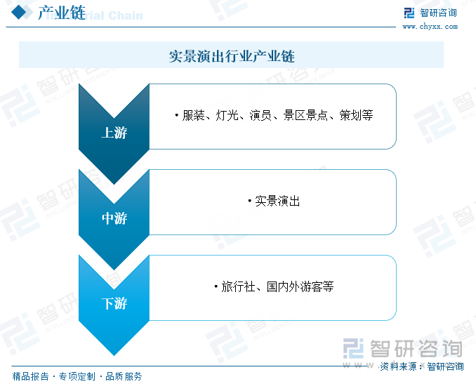 从产业链方面来看,实景演出的上游行业主要是服装、道具、灯光、演员、以及景区景点等,下游行业通过各类销售渠道面向旅行社及游客。实景演出产业上游产业分布较为广泛,对于实景演出的表现力和效果呈现起到关键作用,同时下游景区景点的文化宣传也是实景演出的重要影响因素。