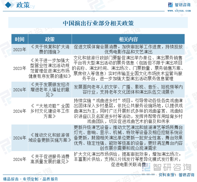 为推动演出行业的发展,我国陆续发布了许多政策,如2024年国家发展改革委等部门发布的《推动文化和旅游领域设备更新实施方案》提出更新升级演艺设备,推动文艺演出和旅游演艺等场所舞台灯光、音响、显示、机械、特效等设备及相应控制系统设备更新,鼓励相关演出单位更新一批安全性高、舞台效果优秀、稳定性强、能效等级高的设备,更好满足舞台内容创作展示需要和观众观演需求。