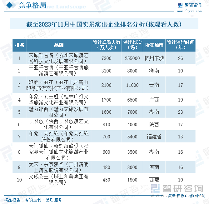 从行业企业格局方面来看,根据不完全统计,截至2023年11月,根据累计观看人数,中国实景演出业内领先企业有宋城千古情(杭州宋城演艺谷科技文化发展有限公司)、三亚千古情(三亚千古情旅游演艺有限公司)、印象·丽江(丽江玉龙雪山印象旅游文化产业有限公司)、印象·刘三姐(桂林广维文华旅游文化产业有限公司)、魅力湘西(魅力文旅发展有限公司)、长恨歌(陕西长恨歌演艺文化有限公司)以及印象·大红袍(印象大红袍股份有限公司)等企业。