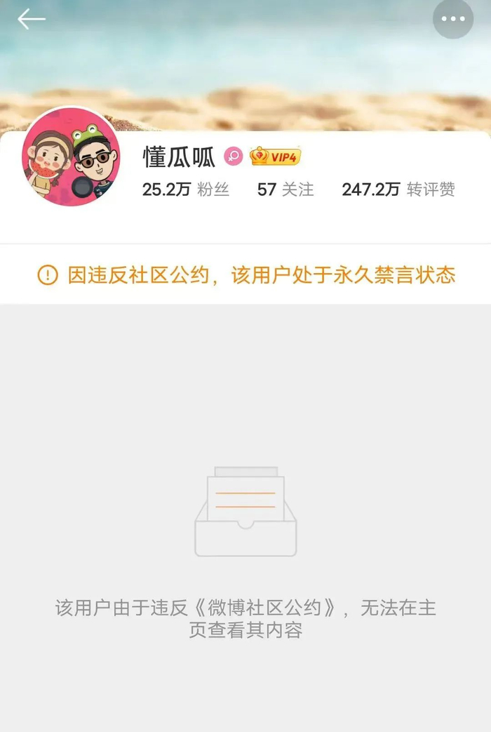 2月25日晚,爆料账号@懂瓜呱 被永久禁言, 该账号微博主页显示:因违反社区公约,该用户目前处于永久禁言状态 。