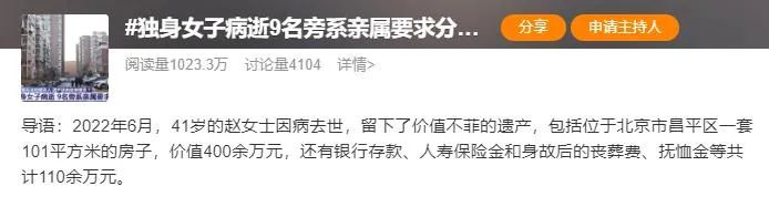 2022年6月,41岁的赵女士因病去世,留下了价值不菲的遗产,包括位于北京市昌平区一套101平方米的房子,价值400余万元,还有银行存款、人寿保险金和身故后的丧葬费、抚恤金等共计110余万元。赵女士的父母均先于其去世,她去世时无配偶、子女,也没有兄弟姐妹。