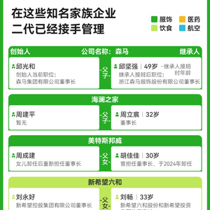 截至 2022 年,有许多大众熟知的企业已经有二代接手管理,如新希望森马服饰春秋航空、益丰大药房。
