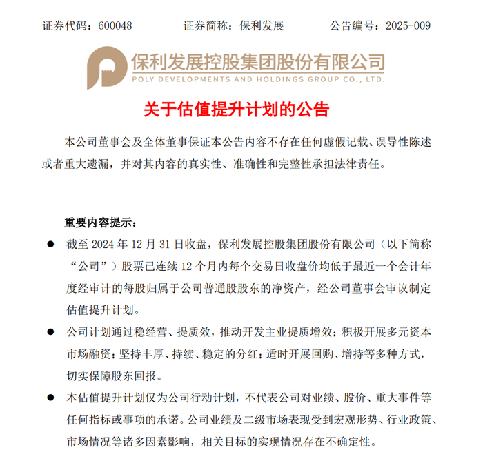 2月25日晚间,保利发展披露,截至2024年12月31日收盘,保利发展股票连续12个月每个交易日收盘价均低于最近一个会计年度经审计的每股归属于公司普通股股东的净资产,经公司董事会审议制定估值提升计划。