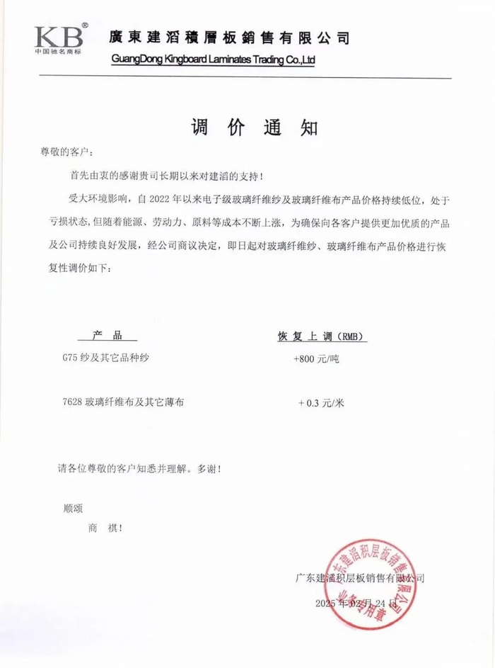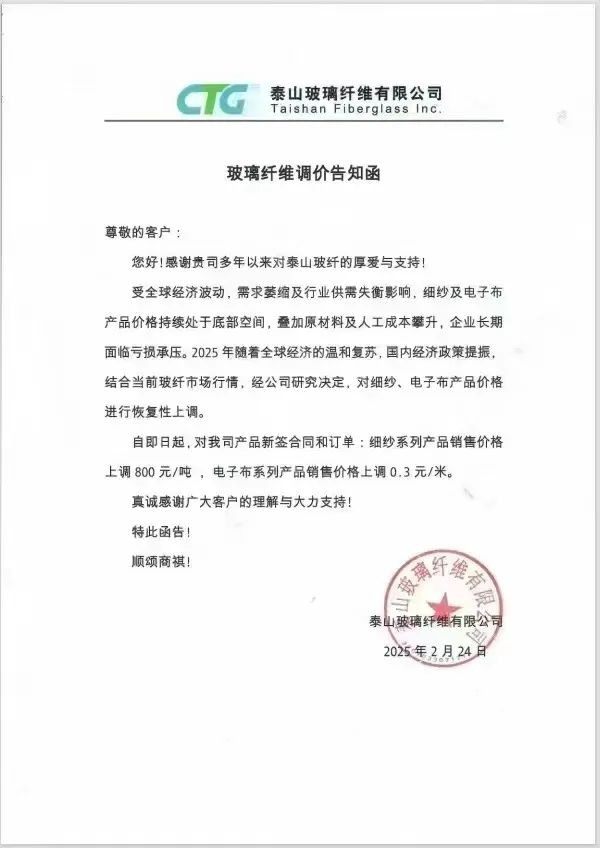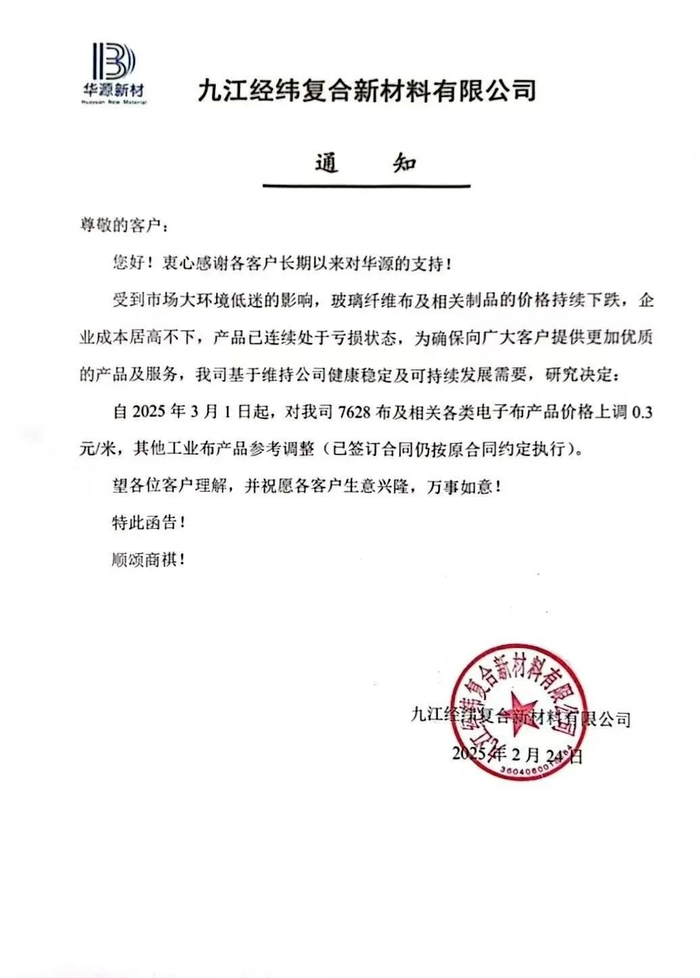 2月24日,泰山玻纤、四川玻纤、广东建滔、江西华源等企业先后发布调价函,对玻璃纤维细纱及电子布等部分产品进行恢复上调价格。调价函中提到,由于电子纱及电子布产品价格长期处于较低水平,同时原材料和能源等成本价格不断上涨,因此,决定对电子纱和电子布的价格分别上调800元/吨和0.3元/米。下面是部分调价函: