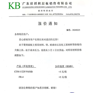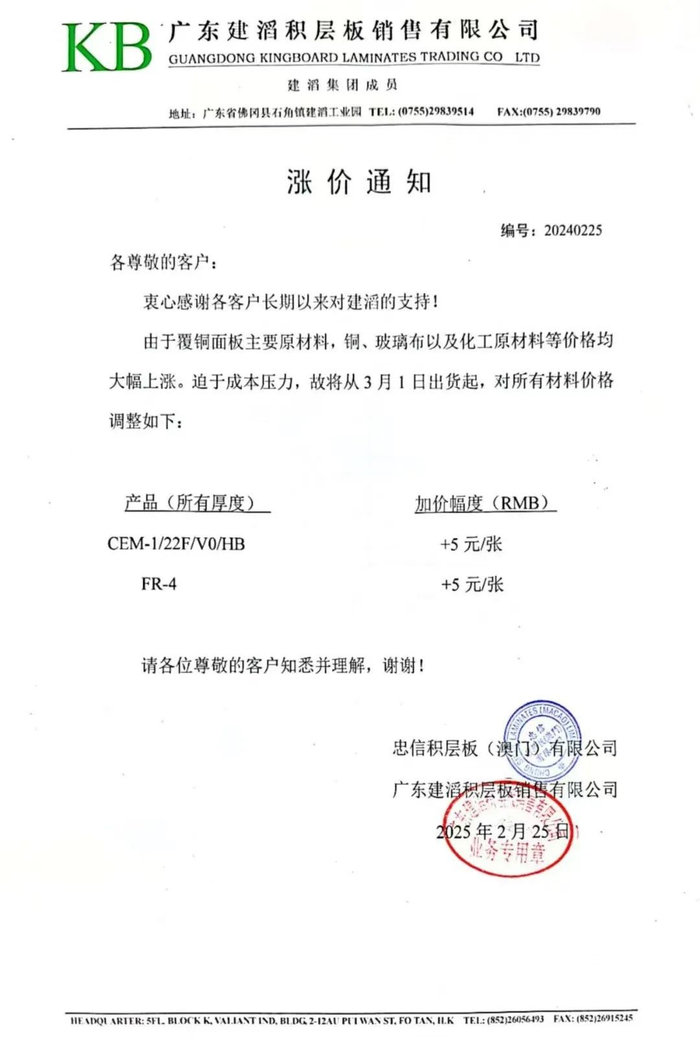 2025刚刚开始,建滔又传涨令。其涨价通知表示,由于覆铜面板主要原材料,铜、玻璃布以及化工原材料等价格均大幅上涨。迫于成本压力,故将从3月1日出货起,对所有材料价格调整如下:CEM-1/22F/V0/HB +5元/张;FR-4 +5元/张。