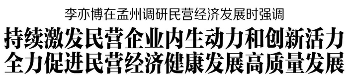 调研中,李亦博听取孟州市民营经济发展情况汇报,强调要一如既往支持民营经济发展壮大,深化“万人助万企”,坚持有事服务、无事不扰,健全政企常态化沟通交流机制,积极主动对接企业实际需求,精准高效落实各项助企惠企利企政策,因地制宜降低企业生产要素成本,用心用情帮助企业排忧解难,以一流营商环境增强企业获得感和满意度,让广大民营企业家在焦作放心投资、安心创业、舒心发展。