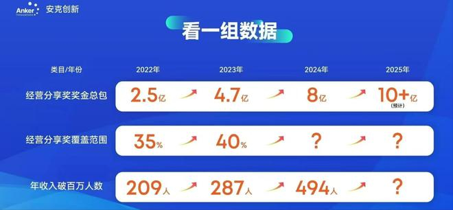 近日,网上流传安克创新一组内部会议照片,照片显示安克创新去年奖金分红8亿元、年收入破百万人数达494人。界面新闻记者从接近安克创新的人士处获悉,这张照片确实是公司内部全员会议中,管理层分享激励机制时引用的。
