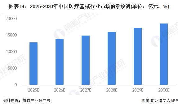 医疗器械行业是中国国民经济发展的重要组成部分,其与中国宏观经济发展息息相关,未来随着中国医疗体系的不断发展,医疗器械行业市场规模或将持续上升。基于此,前瞻估测2030年中国医疗器械行业市场规模或将突破1.8万亿元,2025-2030年复合增长率达到7.53%。