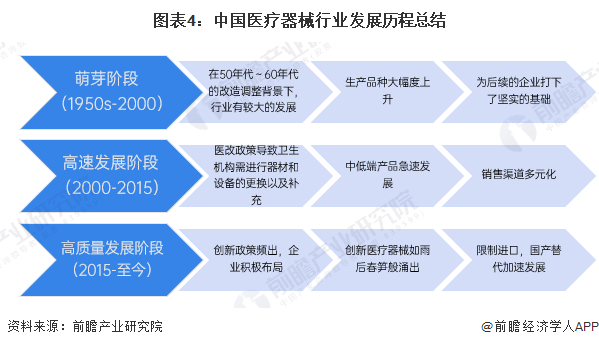 在2000年前,我国医疗器械行业在50年代~60年代的改造调整背景下,我国医疗器械产业有较大发展,经历了从无到有的过程,在新中国成立初期画上了浓墨重彩的一笔。在2000-2015年期间,我国医改政策导致卫生机构需进行器材和设备的更换以及补充,刺激了我国中低端产品和技术的快速增长。但高值医疗器械市场被进口产品占领。在2015年后,我国医疗器械创新政策频出,头部企业积极布局,创新医疗器械如雨后春笋般涌出。此外,为加速国产化替代,我国颁发了相关政策;个别省份像是江苏省等更是禁止进口产品在公立机构中进行招标。