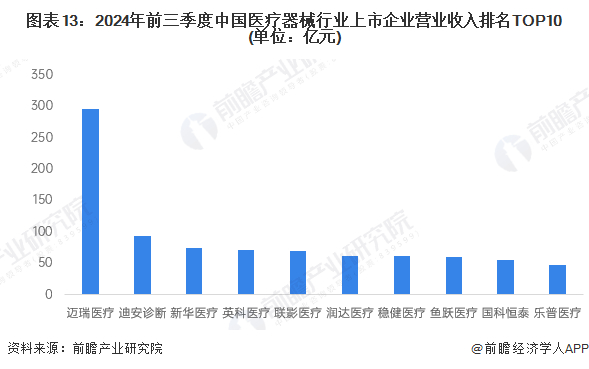 2024年前三季度,迈瑞医疗、迪安诊断、新华医疗、英科医疗、联影医疗的营业收入在上市企业中为TOP5。其中,迈瑞医疗以294.85亿元遥遥领先其它企业。