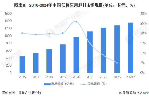 受疫情全球范围蔓延的影响,2020年低值医疗耗材市场,尤其是口罩、防护服等应急防控耗材,短时间内需求呈十倍以上爆发,疫情结束后,我国低值医用耗材市场规模仍保持增长,但增速有所回落。据《中国医疗器械行业蓝皮书(2024)》,2023年我国低值医用耗材市场规模约为1280亿元,同比增长5.26%,2016-2023年复合增长率为16.18%。初步统计2024年超过1300亿元。