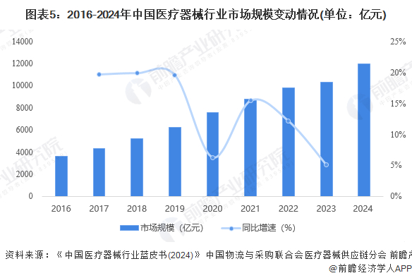中国物流与采购联合会医疗器械供应链分会初步统计,2024年我国医疗器械工业市场规模将突破1.2万亿元。