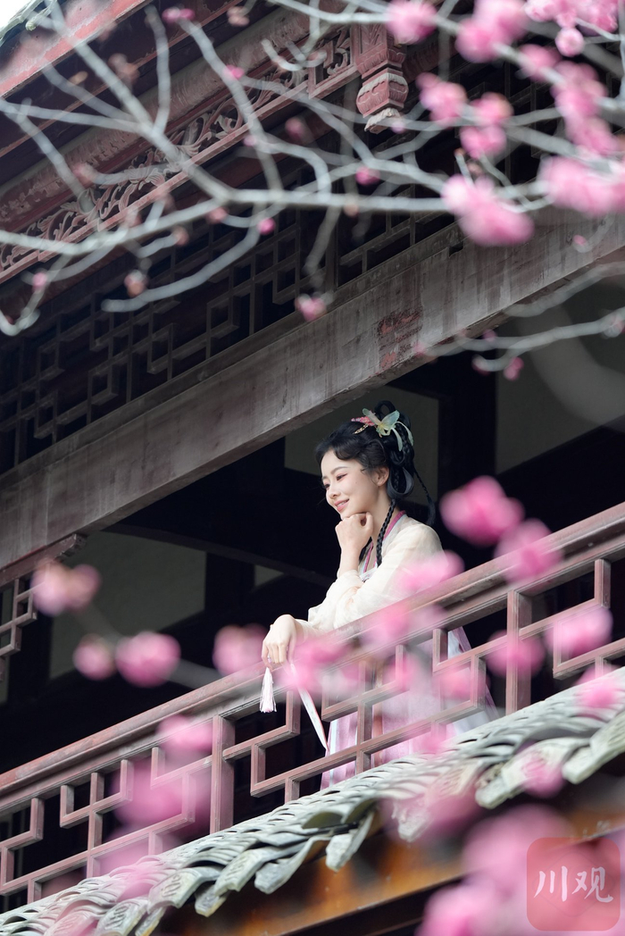 透过梅花,遥看阁楼上的汉服爱好者。