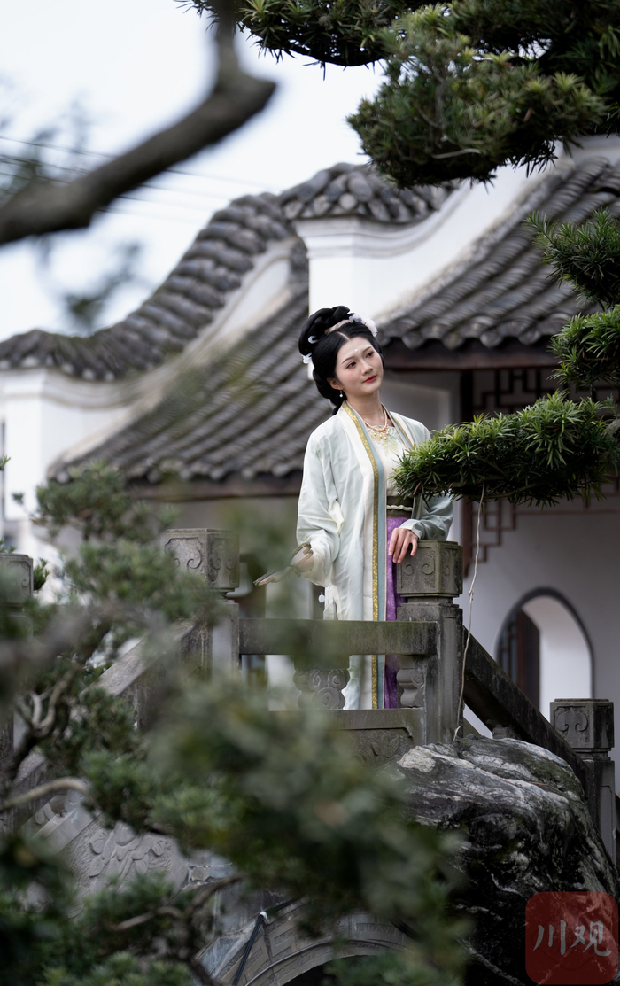 汉服爱好者穿梭于川派盆景其间,配上白墙青瓦,宛如一幅水墨画。