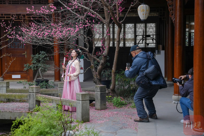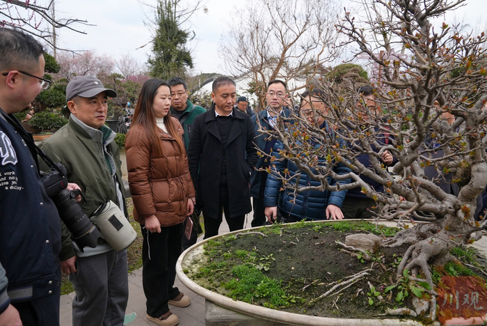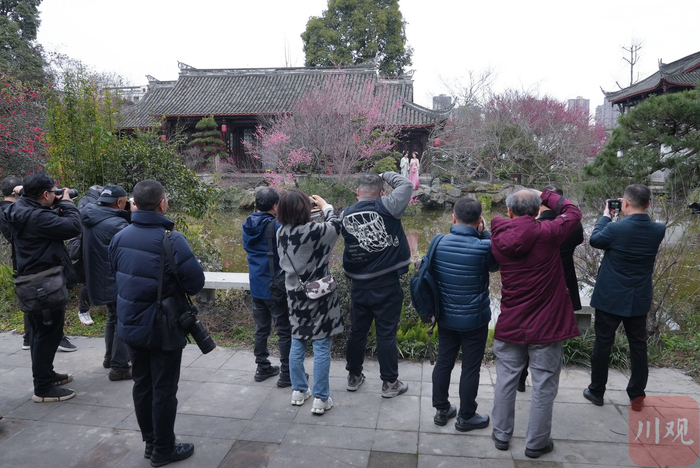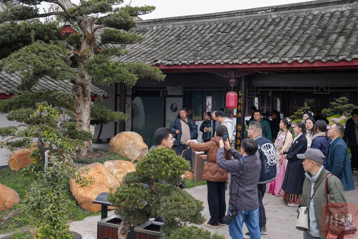 千姿百态的川派盆景再配上海棠花、梅花争奇斗艳,两位汉服爱好者穿梭其间,宛如一幅水墨画,吸引了摄影家们驻足创作。大家不停选取角度、按下快门,不忍错过任何一幅兼具审美价值和观赏效果的精美画卷。