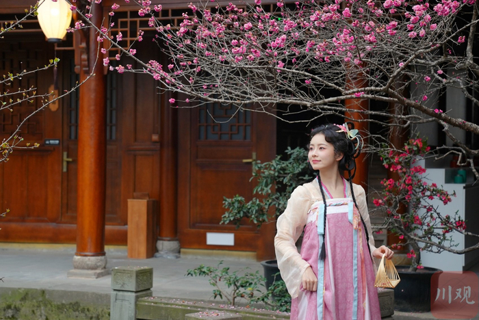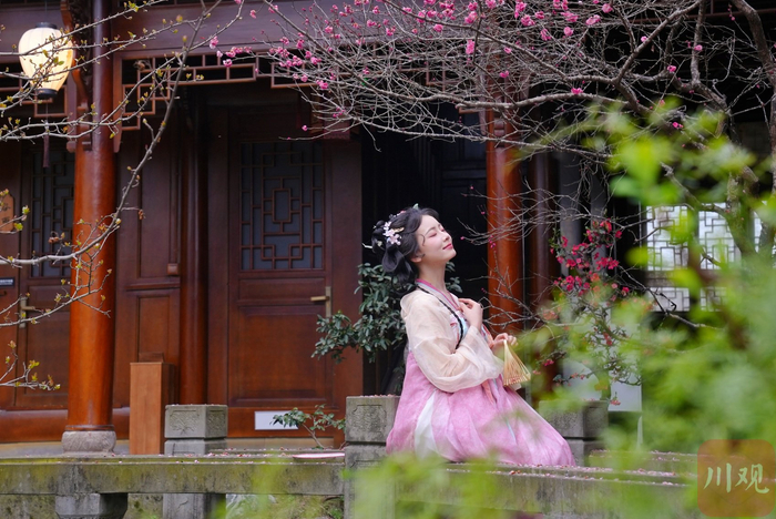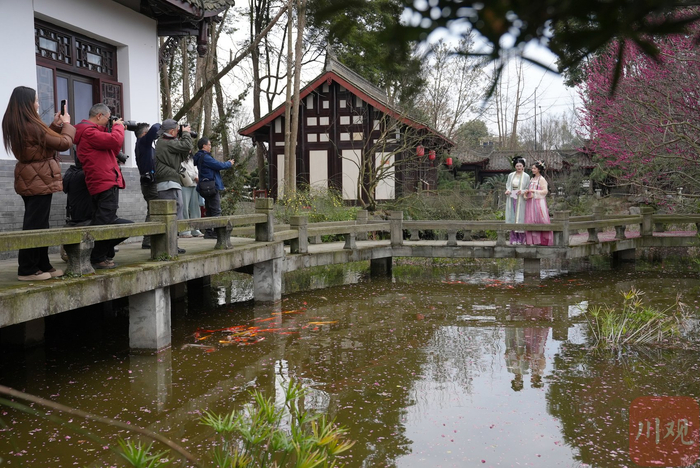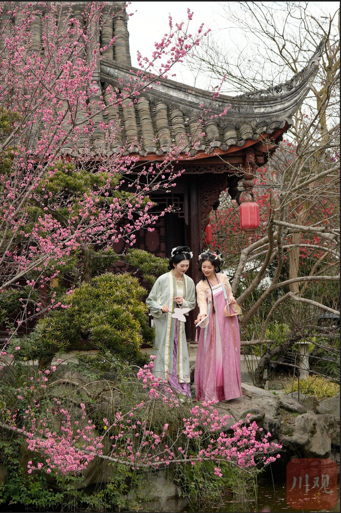 千姿百态的川派盆景再配上海棠花、梅花争奇斗艳,两位汉服爱好者穿梭其间,宛如一幅水墨画,吸引了摄影家们驻足创作。