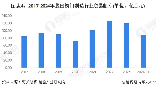 从我国阀门制造行业的贸易顺差趋势来看,2020年,我国阀门制造行业的贸易顺差额为71.84亿美元,较2019年下降20.85%,2021年以来贸易顺差拉大,2023年小幅下滑为120.27亿美元。我国阀门制造行业常年来形成贸易顺差的原因主要是我国劳动力成本较低,拉低了我国阀门的出厂成本从而形成的价格优势。2024年1-11月中国阀门行业贸易顺差为88.82亿美元。