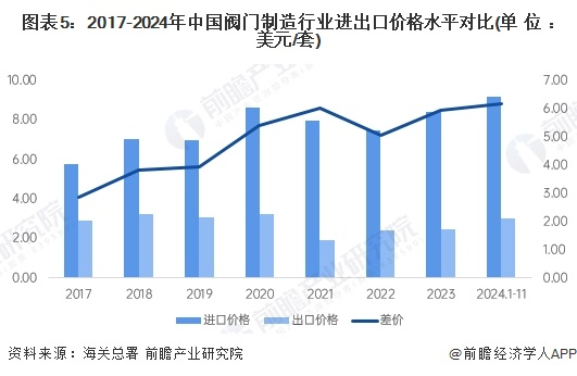 目前我国的阀门制造行业内企业大多只能制造产品利润低、附加价值较低的中低端阀门产品,从而造成了中低端阀门市场供过于求,业内企业只能通过打价格战等恶性竞争的方式来获取市场;而价格高,盈利能力好的高端阀门产品却因为技术限制导致了市场的空白。从中国阀们进出口价格水平可以看出,我国多年来阀门进口价格远高于出口价格,而且价格差距还在逐年加大,2024年1-11月我国阀门进出口的价格差达到了6.17美元/套。