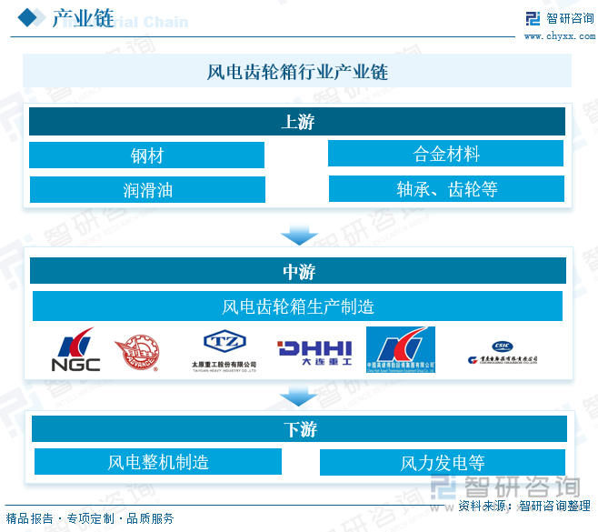 风电齿轮箱行业产业链上游主要为原材料及零部件等,原材料主要包括钢材、合金材料、润滑油等;零部件主要包括轴承、齿轮等。钢材和合金材料的质量直接影响到风电齿轮箱的结构强度、耐久性和使用寿命。高质量的材料能够确保齿轮箱在极端天气和复杂工况下稳定运行。产业链中游主要通过综合运用材料技术、热处理技术、机械加工技术等多学科知识,将上游提供的原材料和零部件加工成符合市场需求的风电齿轮箱产品。下游的风电整机制造商则采购中游生产的风电齿轮箱,与其他部件组装成完整的风力发电机组,并销售给风电场运营商。整个产业链各环节紧密相连,共同推动着风电行业的持续发展。