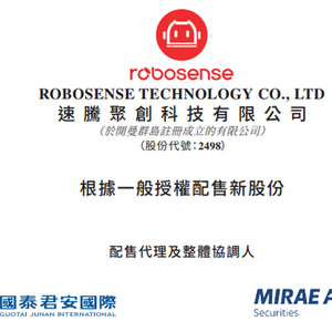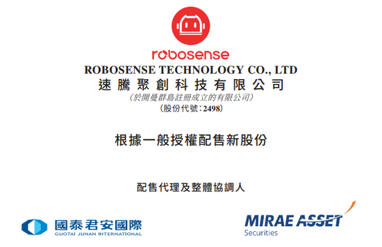 速腾聚创此次配售,国泰君安国际、未来资产为其配售代理、整体协调人。