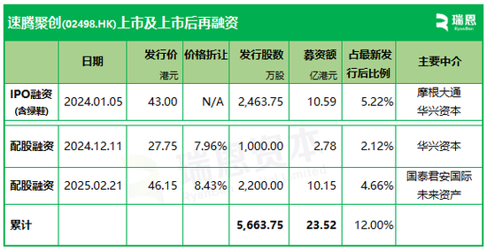 速腾聚创此次配股融资,为其上市约14个月后的第二次再融资,该公司于2024年1月5日在香港主板IPO上市,加计部分行使超额配股权,IPO合计募资约10.59亿港元。
