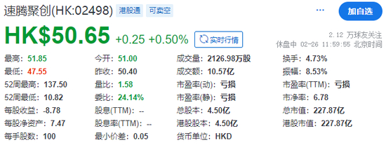 截至午间收市,速腾聚创每股报51.70港元,总市值约227.87亿港元.