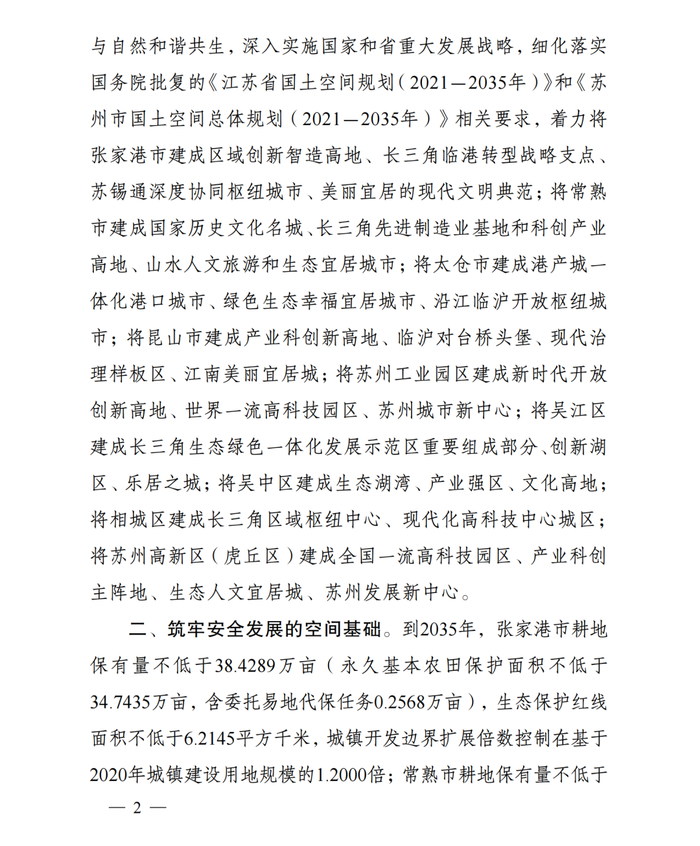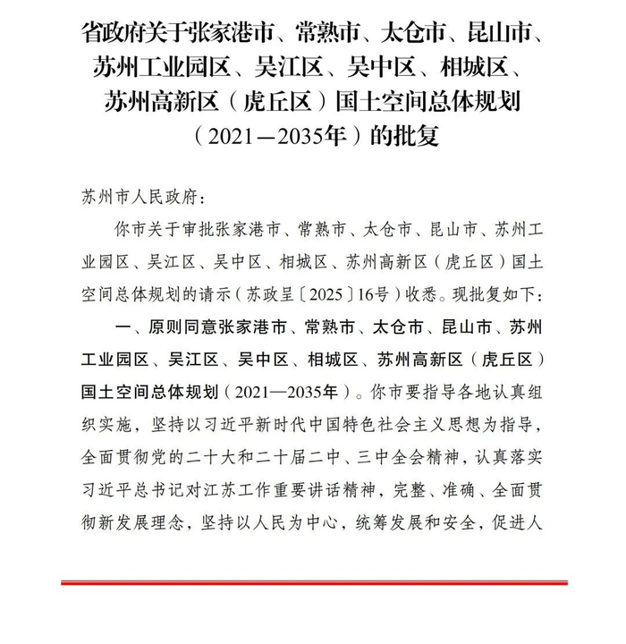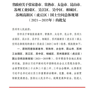 近日,《省政府关于张家港市、常熟市、太仓市、昆山市、苏州工业园区、吴江区、吴中区、相城区、苏州高新区(虎丘区)国土空间总体规划(2021-2035年)的批复》发布。