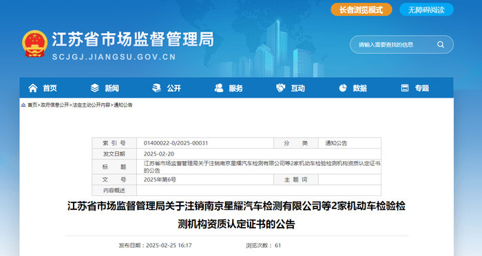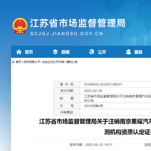 江苏省市场监督管理局发布关于注销南京星耀汽车检测有限公司等2家机动车检验检测机构资质认定证书的公告