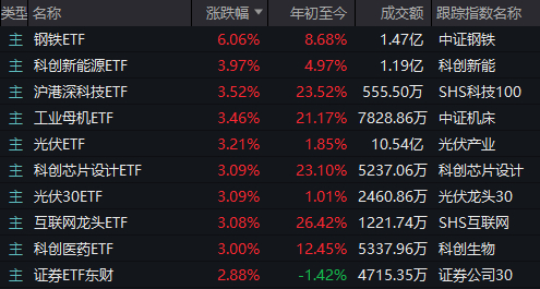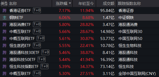 前述浙商证券研报发布于昨日盘后,但有趣的是,截至今天收盘,场内ETF中,虽然跨境型产品(如港股消费ETF、中概互联ETF)大面积霸榜,钢铁ETF却是唯一一支涨幅与它们不相上下的主题型产品。