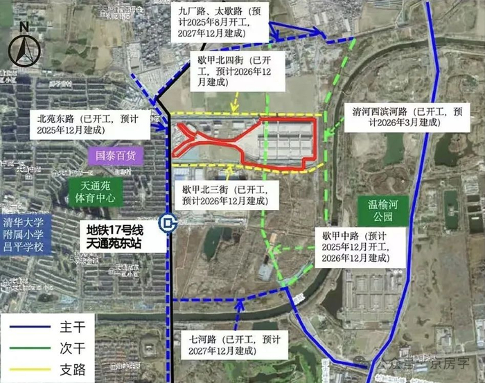 其中,地铁17号线歇甲村车辆段地块距离地铁天通苑东站约6百米,周边有清华大学附小昌平学校天通苑校区,清华长庚医院等配套。